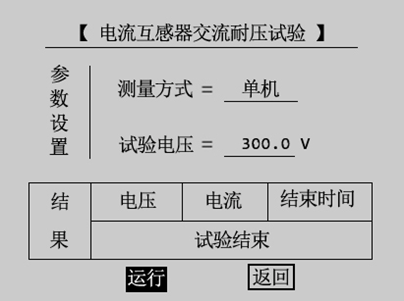 檢查接線完成后,選擇運行,儀器開始升壓,升至試驗電壓后,電壓保持時間默認一分鐘,互感器綜合特性測試儀儀器內部對互感器二次繞組與外殼之間的漏電流和儀器實際輸出電壓實時檢測,并顯示在界面上,同時顯示交流耐壓倒計時,如圖3.25所示。試驗結束后,調壓器自動歸零,界面顯示“試驗結束”。如圖3.26所示。